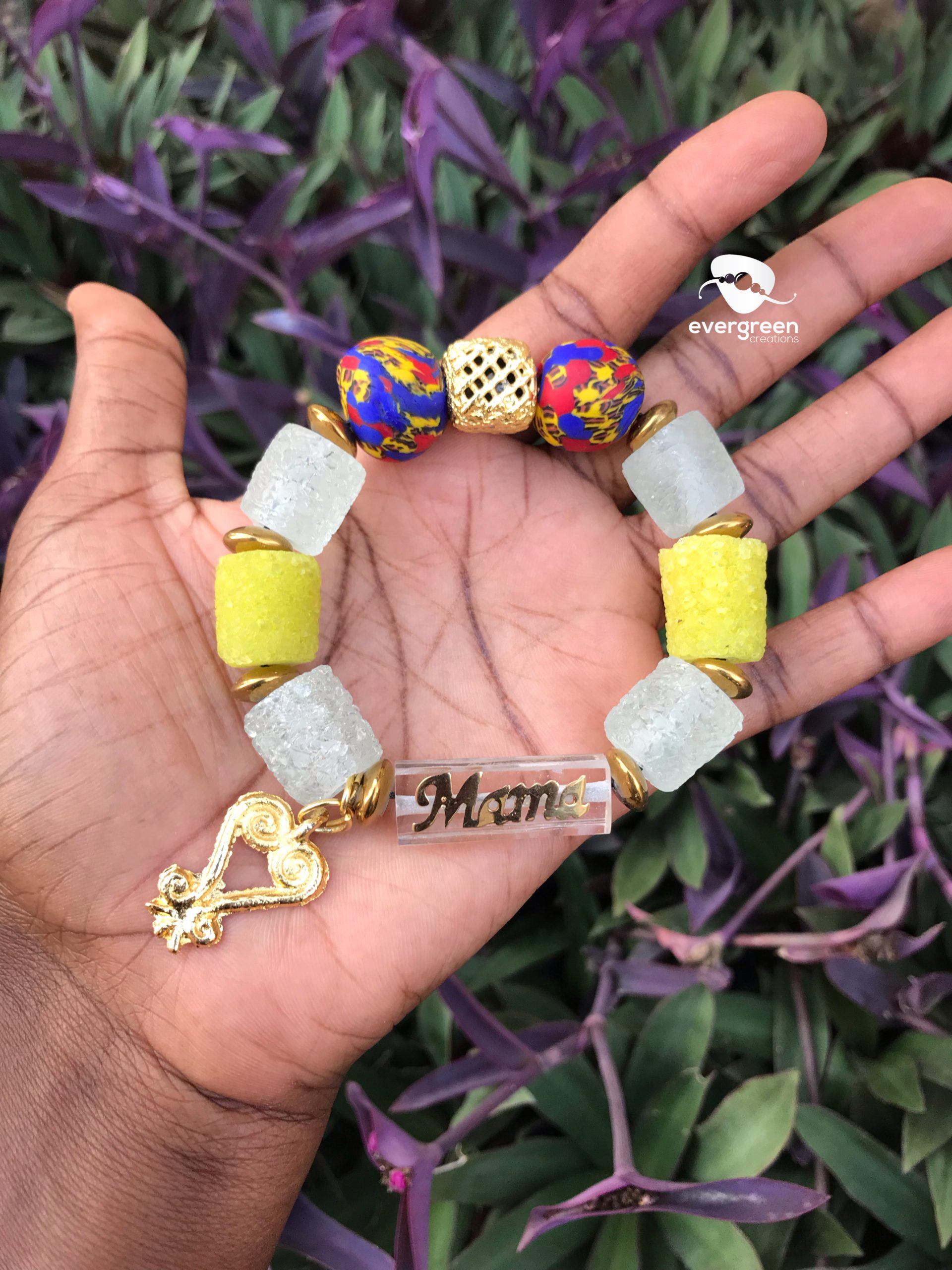 A beautiful variety of traditional sugar beads, traditional glass beads, acrylic name tag and gold brass adinkra charms.