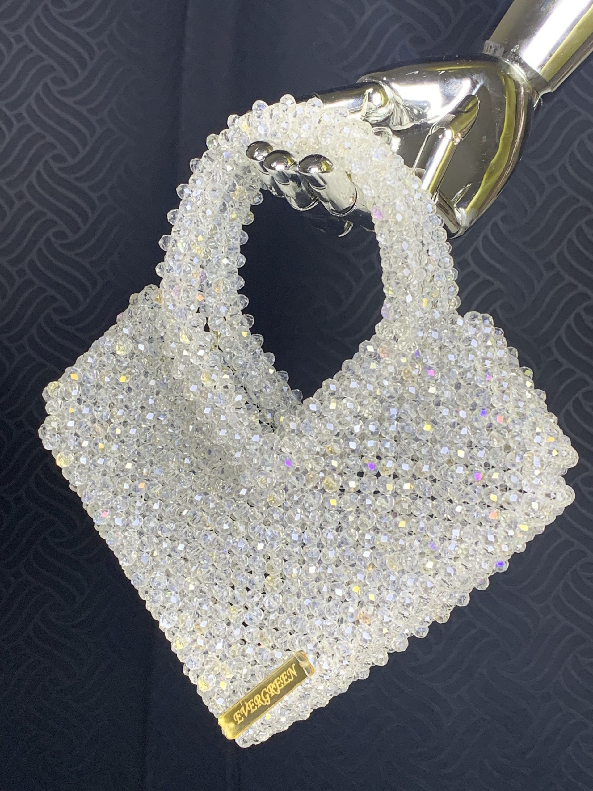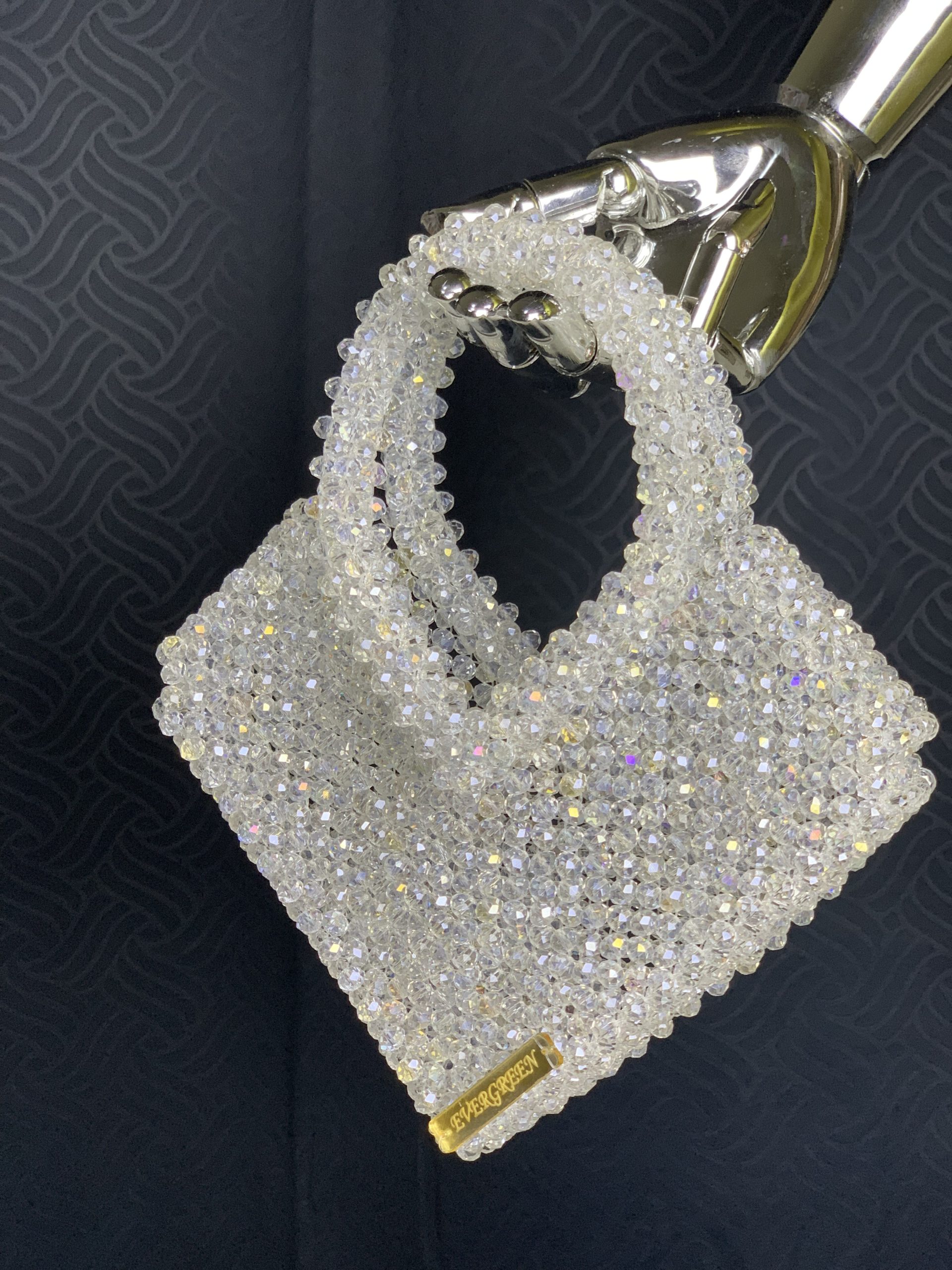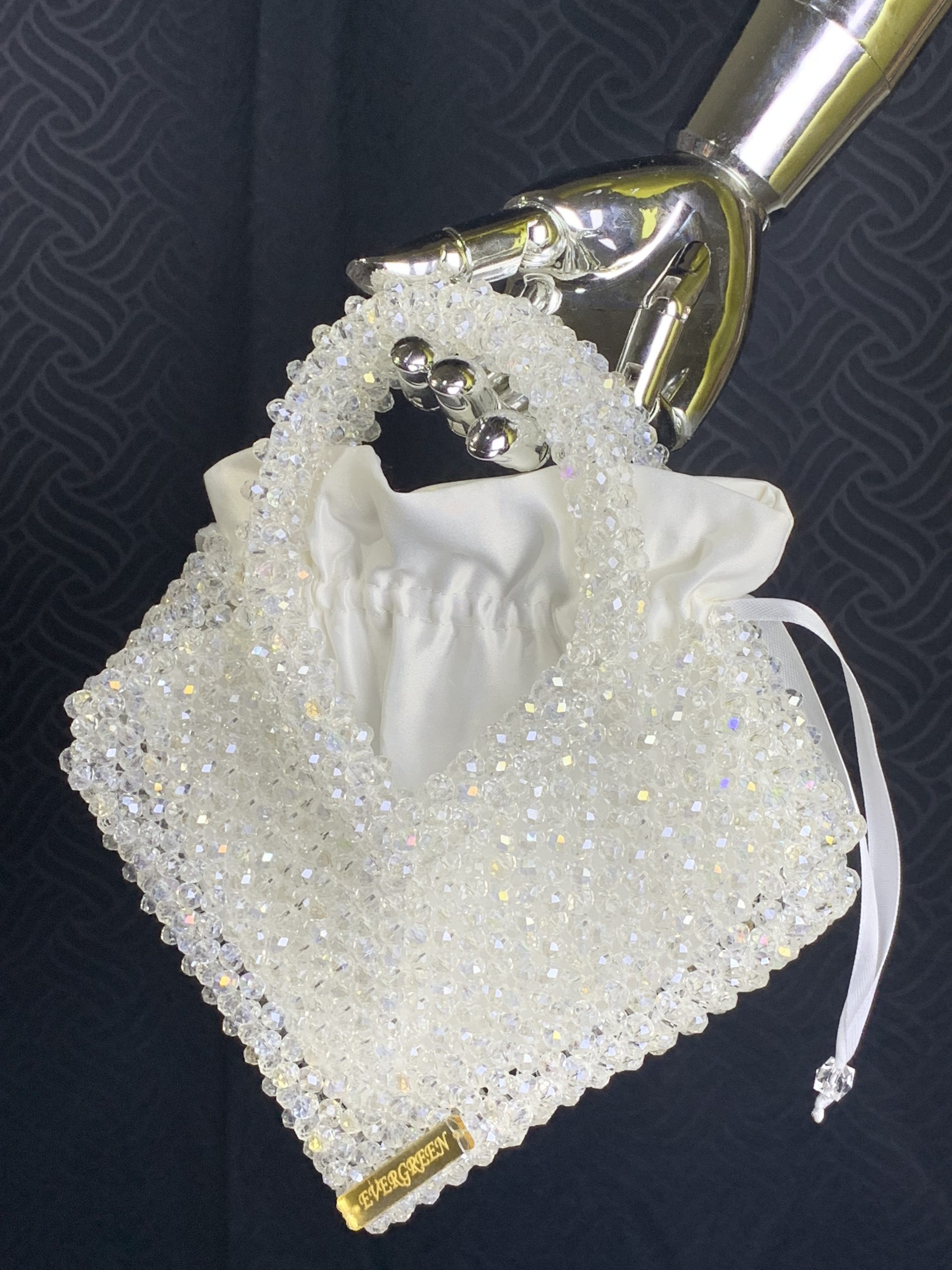 Made with white clear 8mm Rondelle crystals, lined with a bridal satin drawstring removable pouch,